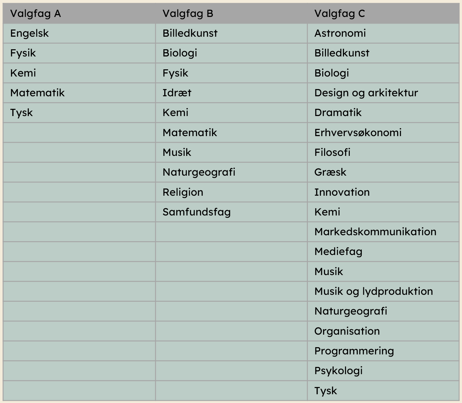 Her kan du se, hvilke fag og niveauer der indgår i studieretningerne på STX, og hvilke valgfag du bliver tilbudt: